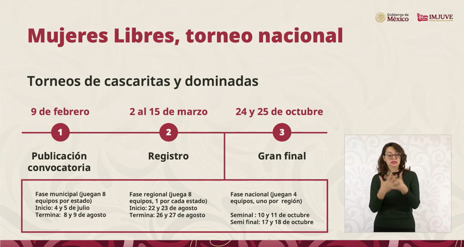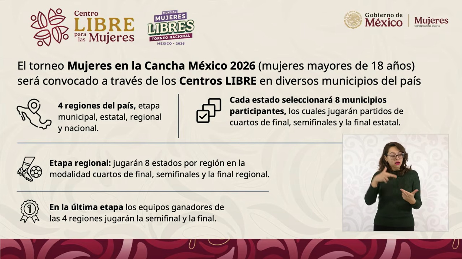 Finalmente, la funcionaria señaló que el calendario general contempla la definición de municipios en febrero, el cierre de registros en marzo y el desarrollo del torneo de julio a octubre, al tiempo que se dará acompañamiento institucional a todas las competencias femeniles organizadas por el Gobierno de México, con énfasis en la participación de niñas, jóvenes y mujeres en las canchas del país.