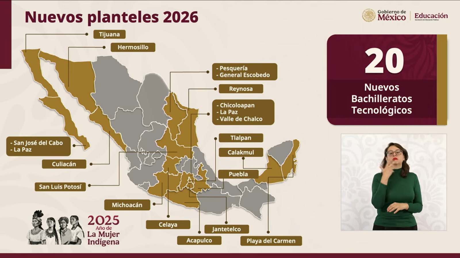 Rodríguez explicó que, a partir de un diagnóstico nacional, se identificaron escuelas con alta demanda en zonas urbanas y rurales, así como municipios con amplio crecimiento demográfico, donde se construirán 20 nuevos bachilleratos tecnológicos. Estos planteles estarán ubicados en ciudades como Tijuana, Calakmul, Escobedo, Celaya, Acapulco y Quintana Roo, y en su primera etapa podrán atender a más de 900 estudiantes por escuela.