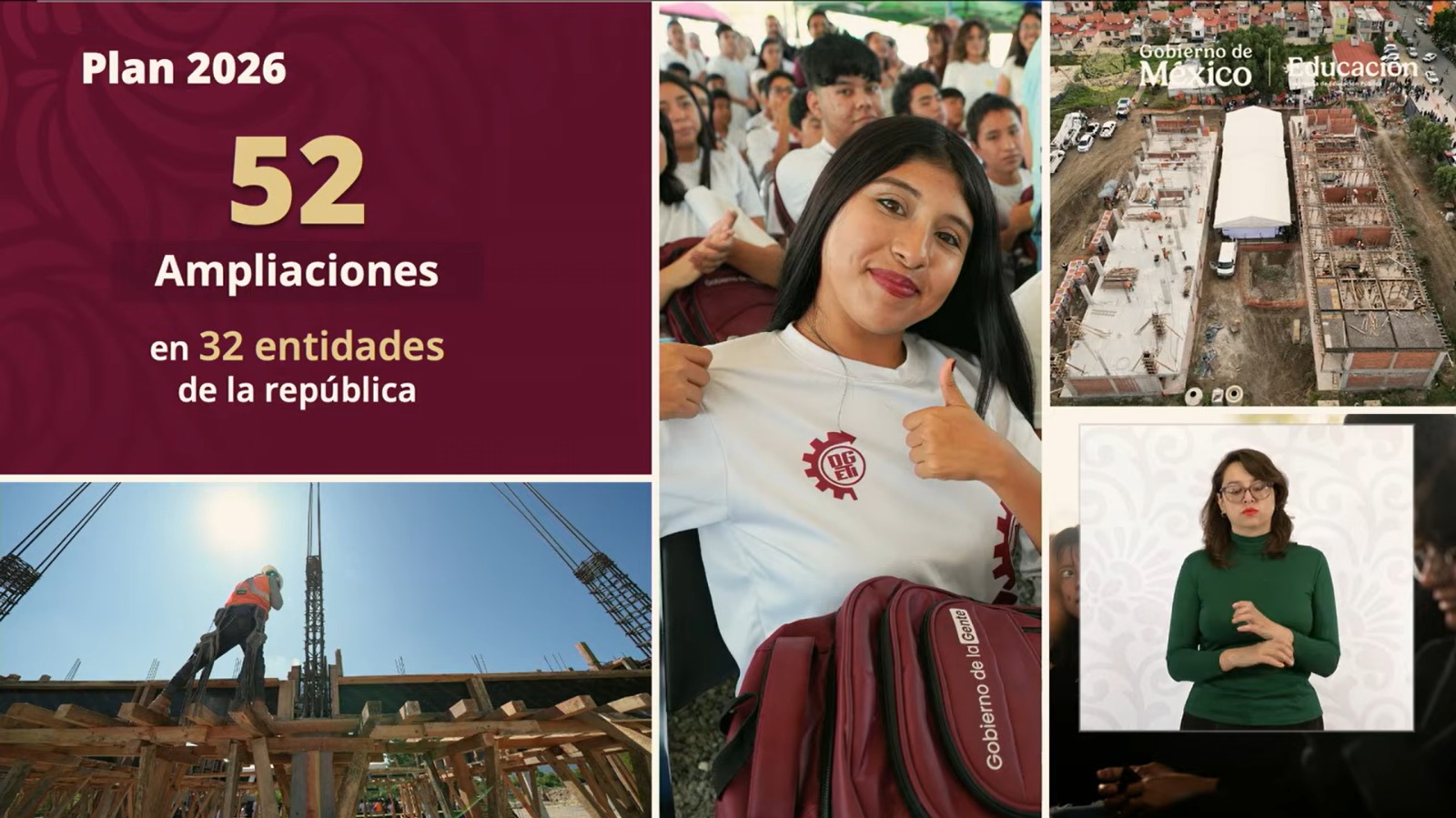 Asimismo, se llevarán a cabo 52 ampliaciones en planteles del Bachillerato Nacional, distribuidos en todos los estados del país, con el propósito de habilitar nuevos salones, laboratorios de cómputo y talleres actualizados. Estas acciones también fortalecerán la formación académica y los programas tecnológicos impulsados por el Gobierno Federal.