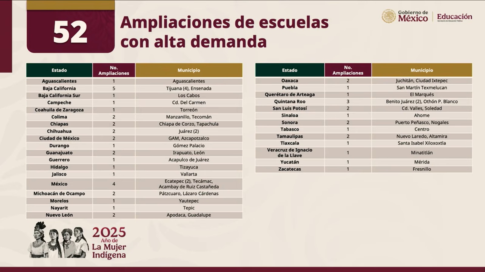 Entre los casos prioritarios, mencionó Tijuana, donde se realizarán cuatro ampliaciones con el propósito de cubrir los 2 mil espacios educativos pendientes y lograr una cobertura completa en el siguiente ciclo escolar.