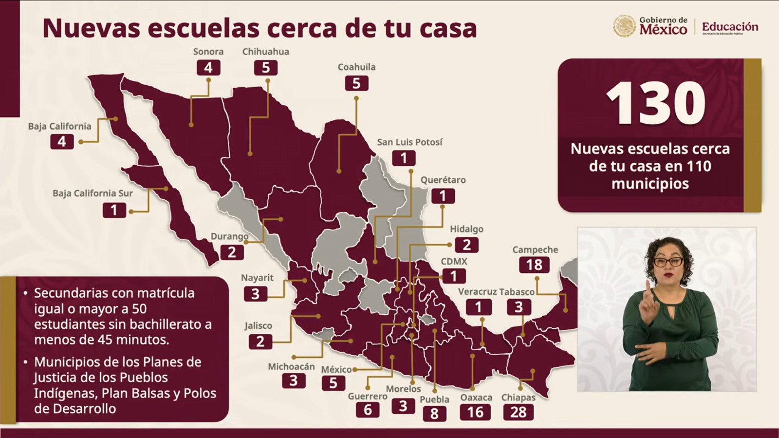 El plan contempla acercar 130 nuevas escuelas a zonas con alta matrícula de secundaria y sin acceso a planteles de educación media superior a menos de 45 minutos de distancia, con lo que se busca garantizar el derecho a la educación y la inclusión de jóvenes en todo el territorio nacional.