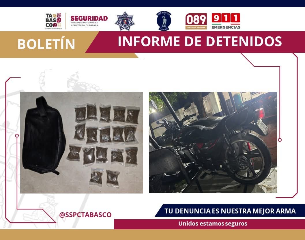Durante la intervención, los agentes aseguraron bolsitas con hierba verde seca con características de marihuana, una bolsa tipo neceser color negro con la leyenda CAAG y una motocicleta Italika FT150 color negro con placas del estado de Tabasco, presuntamente utilizada en actividades ilícitas.