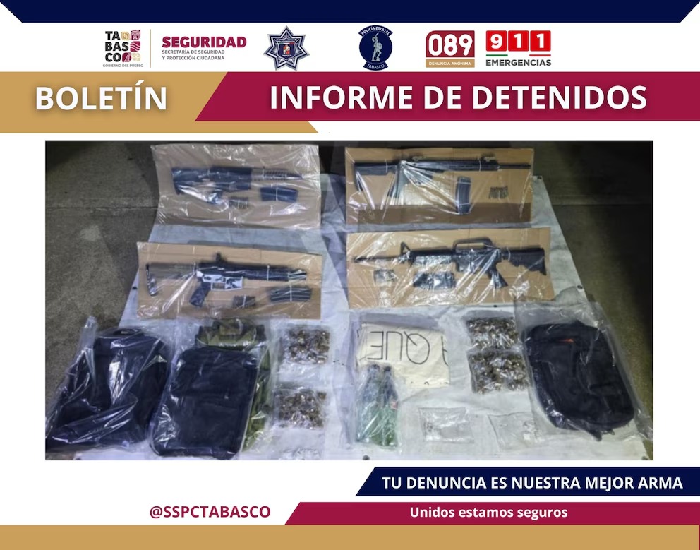 Un operativo de la Fuerza Interinstitucional de Reacción Táctica (FIRT) Olmeca y el Grupo Especial “Tabscoob” terminó con la captura de cuatro hombres fuertemente armados que transportaban droga, rifles y una manta con amenazas, sobre la carretera Villahermosa–Macuspana.