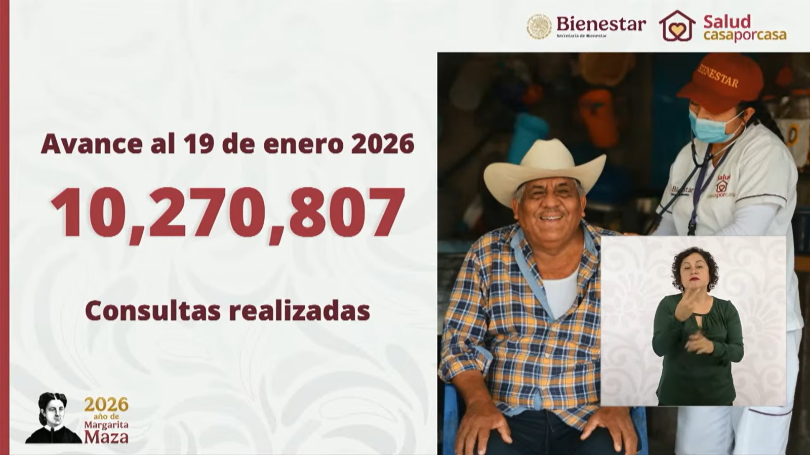 El programa de salud Casa por Casa ha alcanzado 10 millones 270 mil consultas médicas domiciliarias gratuitas, dirigidas a adultos mayores y personas con discapacidad, y entrará en una segunda etapa de visitas para este mismo grupo de derechohabientes, de acuerdo con el reporte presentado por la secretaria de Bienestar, Ariadna Montiel Reyes.