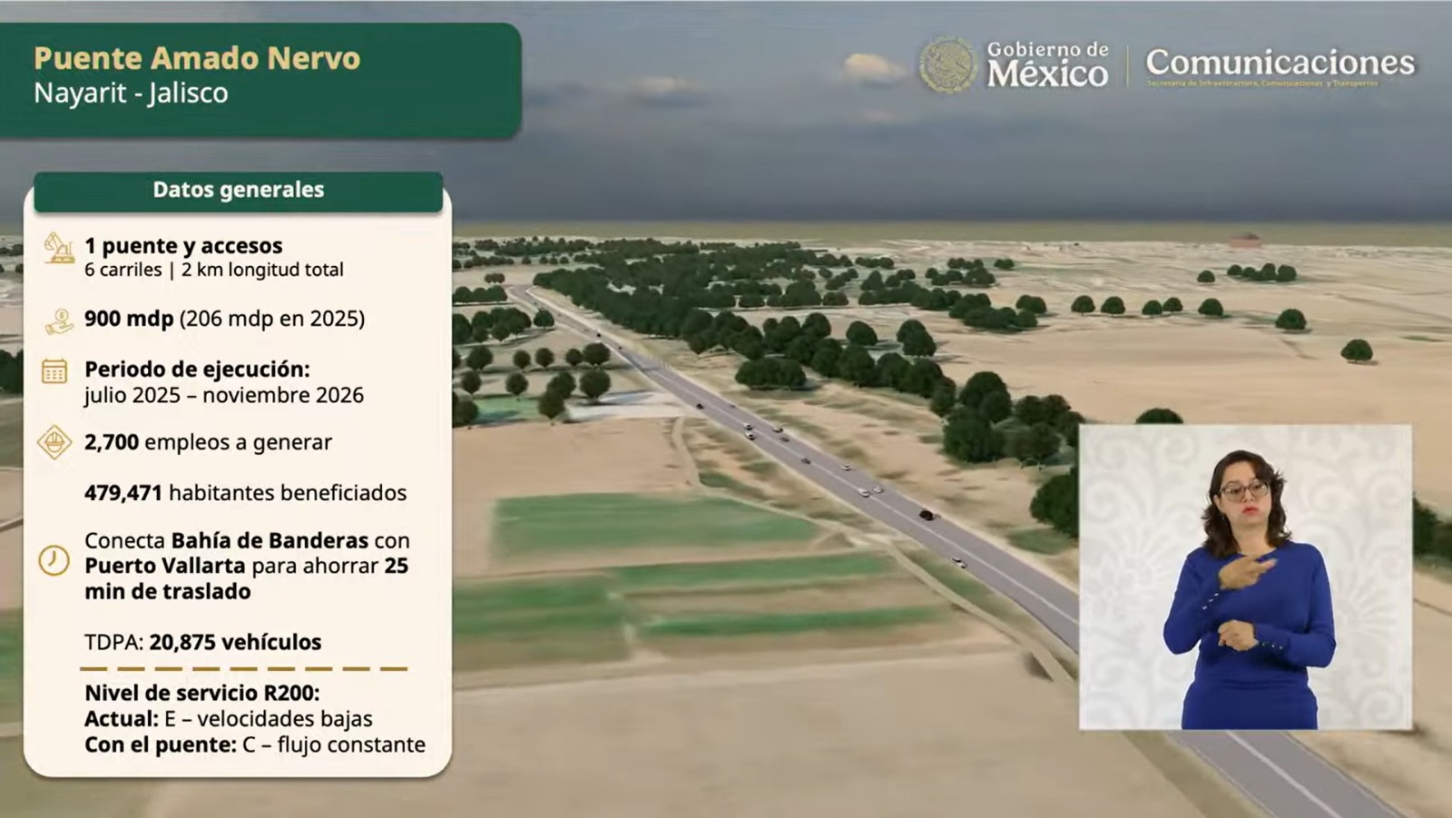 El titular de la Secretaría de Infraestructura, Comunicaciones y Transportes (SICT), Jesús Esteva, informó que el proyecto tendrá una longitud total de 2 kilómetros: 800 metros de estructura principal y 1,220 metros de accesos —364 metros en Nayarit y 856 en Jalisco—, con una inversión de 900 millones de pesos.