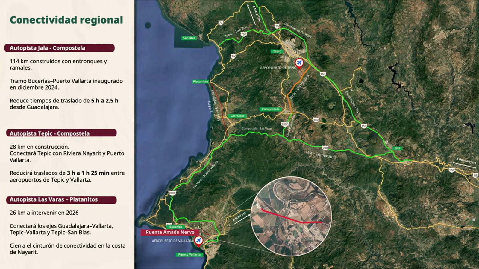 La SICT destacó que el puente unirá la carretera federal 200 con la carretera estatal 544, facilitando el tránsito de 20 mil vehículos diarios y ofreciendo una vía alterna para cruzar el río Ameca, lo que impulsará la seguridad vial y la economía regional en Nayarit y Jalisco.