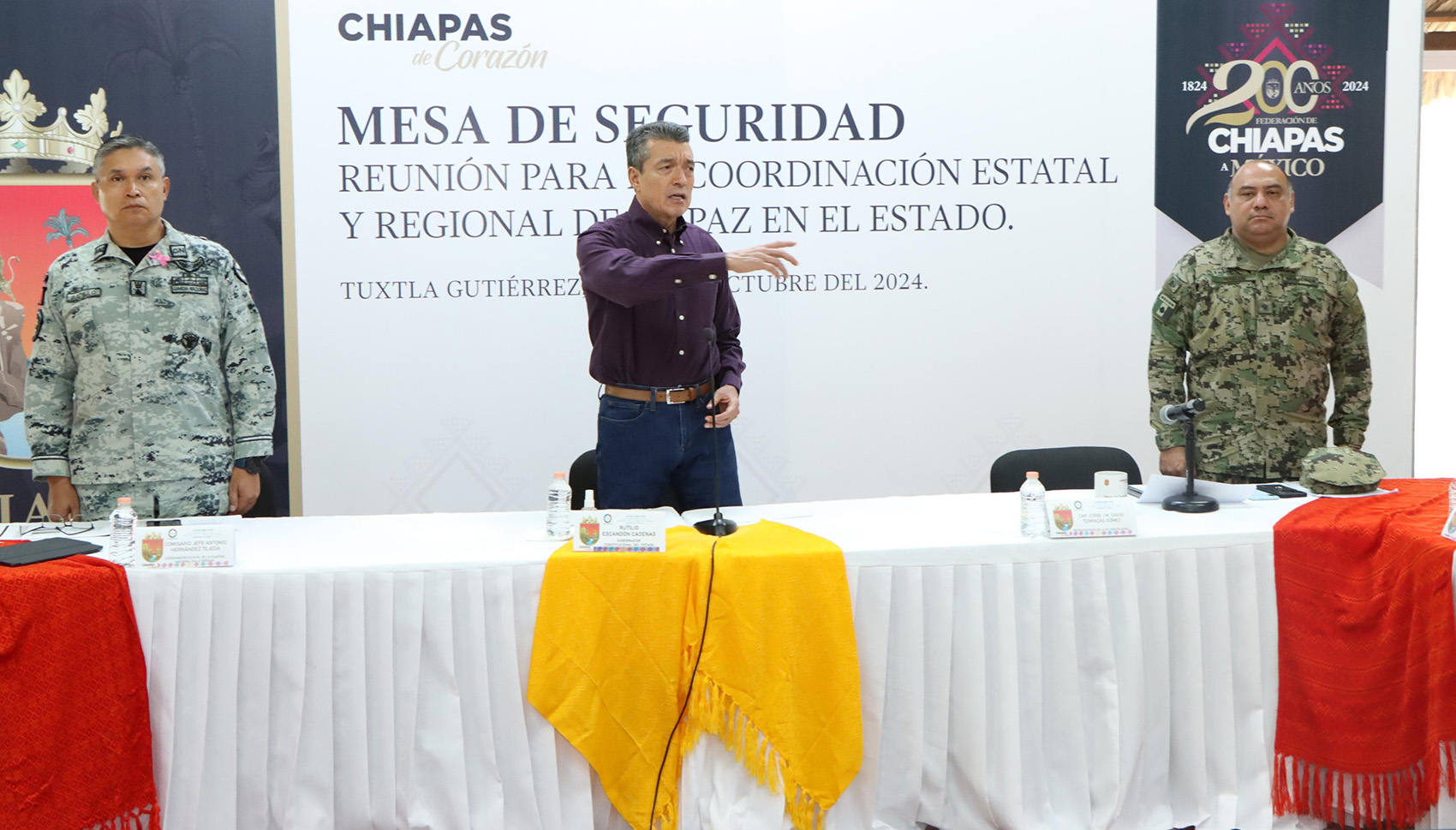 Cabe mencionar que la Mesa de Coordinación Estatal para la Construcción de la Paz y la Seguridad se activa en las primeras horas de cada día en la capital chiapaneca, donde participan autoridades federales y estatales como son el Ejército Mexicano, la Marina, Guardia Nacional, las instancias de seguridad, protección civil, salud y de procuración de justicia, el Instituto Nacional de Migración, el Centro Nacional de Inteligencia, el Poder Judicial del Estado, la Comisión Estatal de los Derechos Humanos, entre otros.