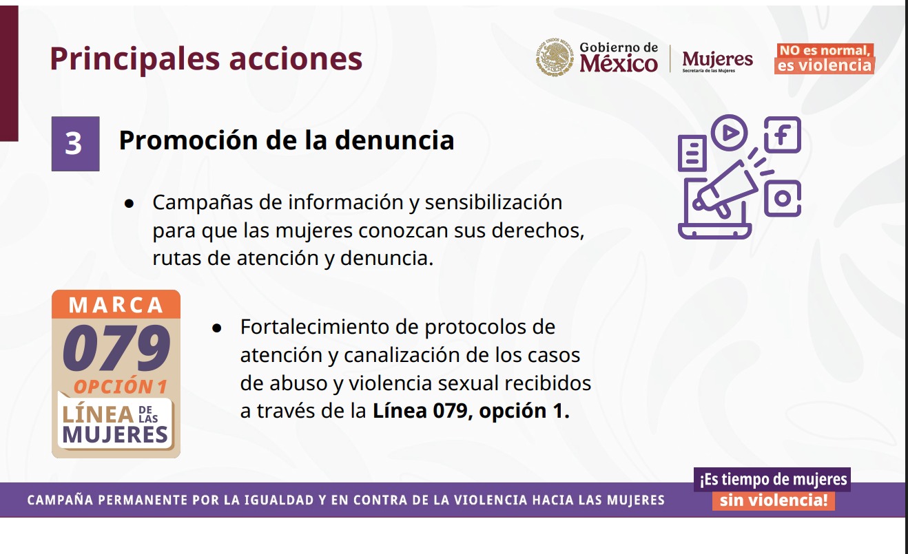 Otro eje central del plan es la promoción de la denuncia, mediante campañas de información y sensibilización que orienten a las víctimas sobre sus derechos y las rutas de atención disponibles. Se fortalecerán los protocolos de respuesta a través de la Línea 079, opción 1, que recibe casos de abuso y violencia sexual.