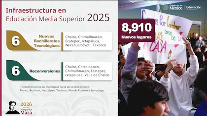 En paralelo, para 2026 se proyecta la creación de 4 mil 950 nuevos espacios en educación media superior a través de la construcción de tres bachilleratos tecnológicos, que estarán ubicados en Chicoloapan, La Paz y Valle de Chalco, municipios caracterizados por su crecimiento poblacional y alta presión sobre la infraestructura escolar existente.