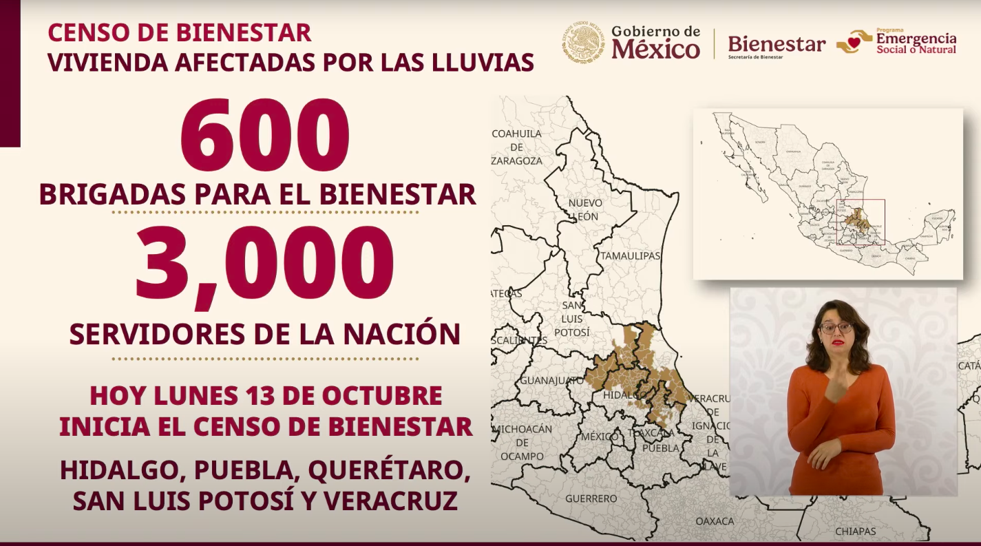 La respuesta llegó con rapidez y en cifras grandes. Tras las lluvias que dejaron 64 fallecidos y afectaciones en más de 100 municipios del país, el Gobierno de México desplegó 600 brigadas del Bienestar y 3 mil Servidores de la Nación para levantar el Censo de Viviendas Afectadas por las Lluvias, que comenzó este lunes 13 de octubre en Hidalgo, Puebla, Querétaro, San Luis Potosí y Veracruz.