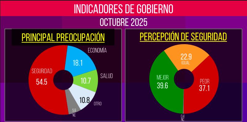 La inseguridad se mantiene como la principal preocupación ciudadana, seguida por la economía y los servicios de salud. Aunque estos temas son señalados como áreas de mejora, la mayoría de los encuestados reconoce avances en los programas sociales y en el manejo de las relaciones internacionales, lo que explica la estabilidad en la aprobación general.