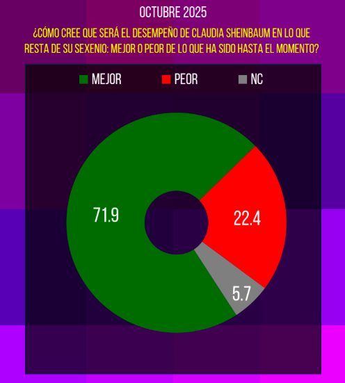 Uno de los datos más relevantes del sondeo es el optimismo ciudadano sobre el futuro del gobierno: 72% de los encuestados cree que el desempeño de Sheinbaum mejorará en lo que resta del sexenio, mientras solo 22% prevé un escenario menos favorable.