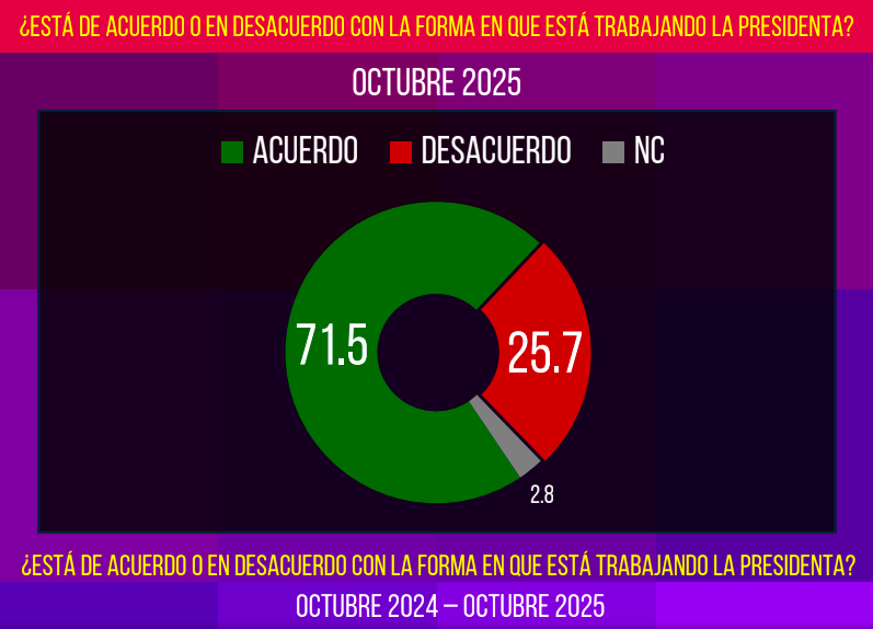 La presidenta Claudia Sheinbaum conserva estabilidad en la aprobación ciudadana con 71.5% a 13 meses de haber iniciado su gestión; fortalece el apoyo entre beneficiarios de programas sociales, y enfrenta retos de seguridad y economía.
