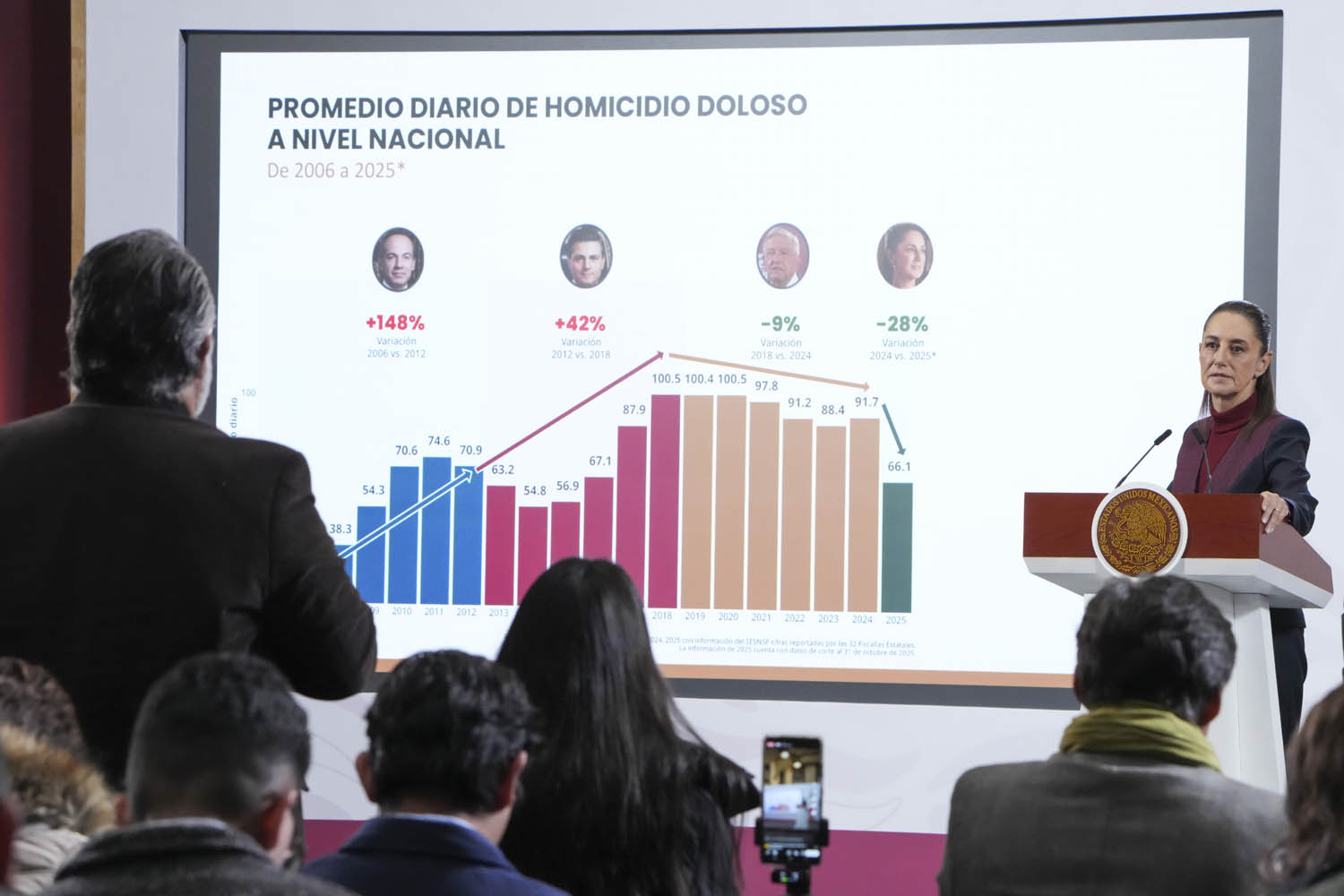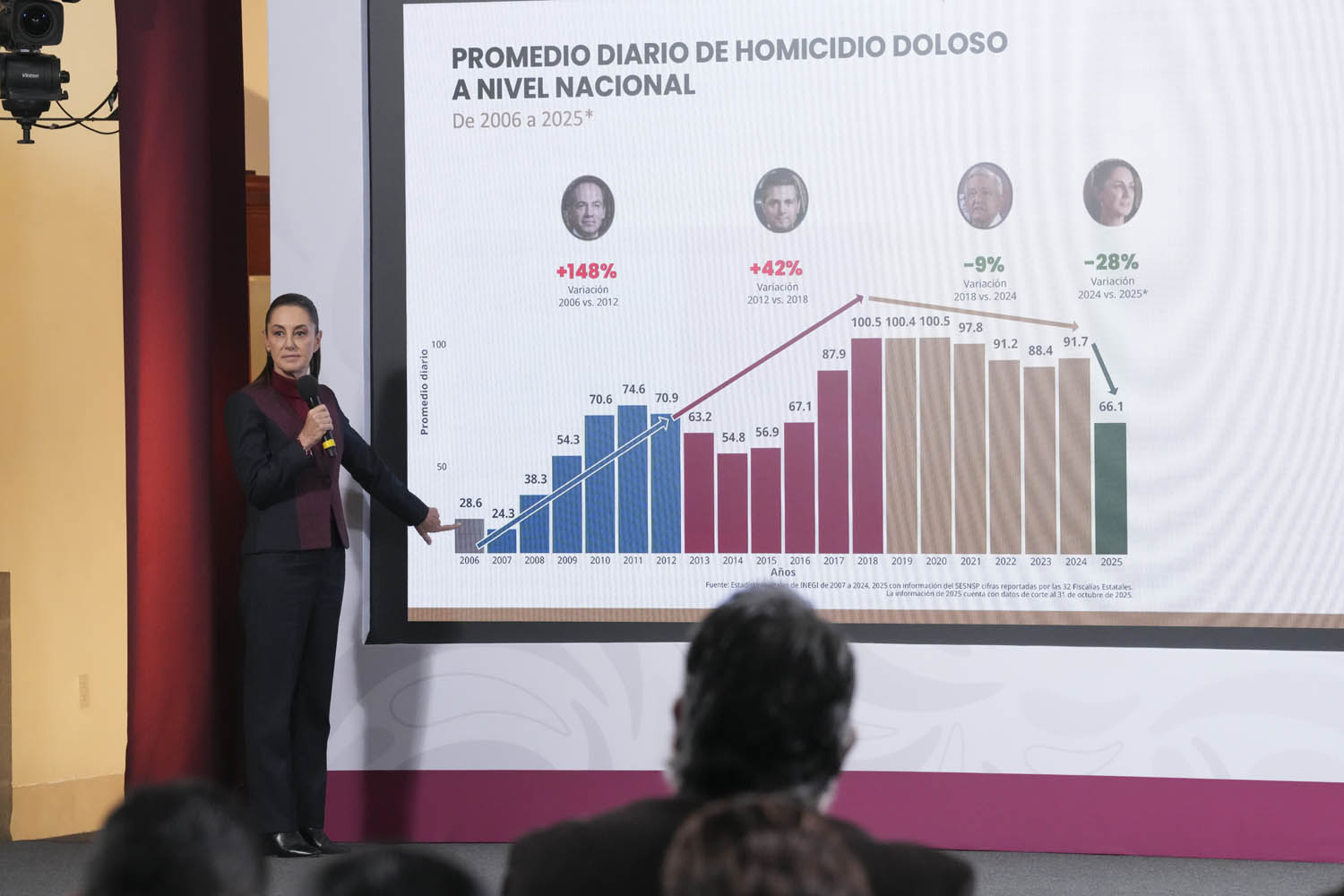 Durante la Conferencia del Pueblo en Palacio Nacional, la presidenta Claudia Sheinbaum Pardo presentó los resultados de su estrategia de seguridad y señaló que del último año del presidente Peña Nieto al último año del presidente López Obrador los homicidios dolosos se redujeron en 9%, mientras que de septiembre de 2024 a octubre de 2025, ya bajo su administración, la disminución es de 37%.