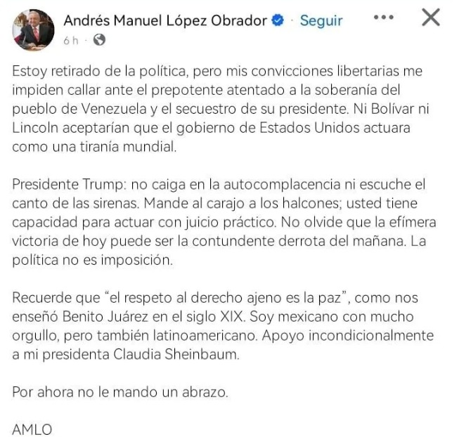 Claudia Sheinbaum, presidenta de México, expresó su respaldo al mensaje difundido por el expresidente Andrés Manuel López Obrador luego de la intervención de Estados Unidos en Venezuela, al considerar que se trata de un pronunciamiento firme y claro en defensa de la soberanía, postura que —subrayó— comparte plenamente y que ha sido una constante dentro del movimiento que encabeza la Cuarta Transformación.