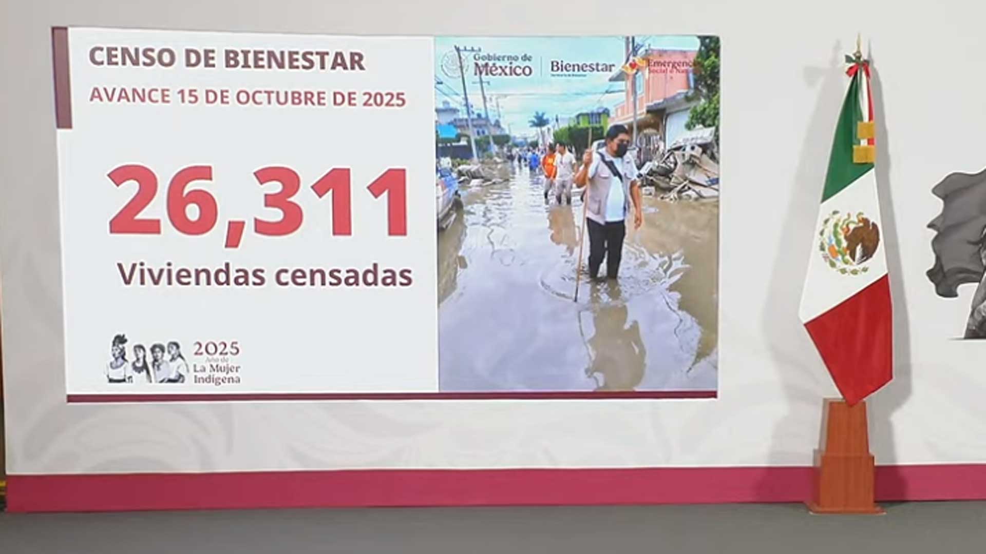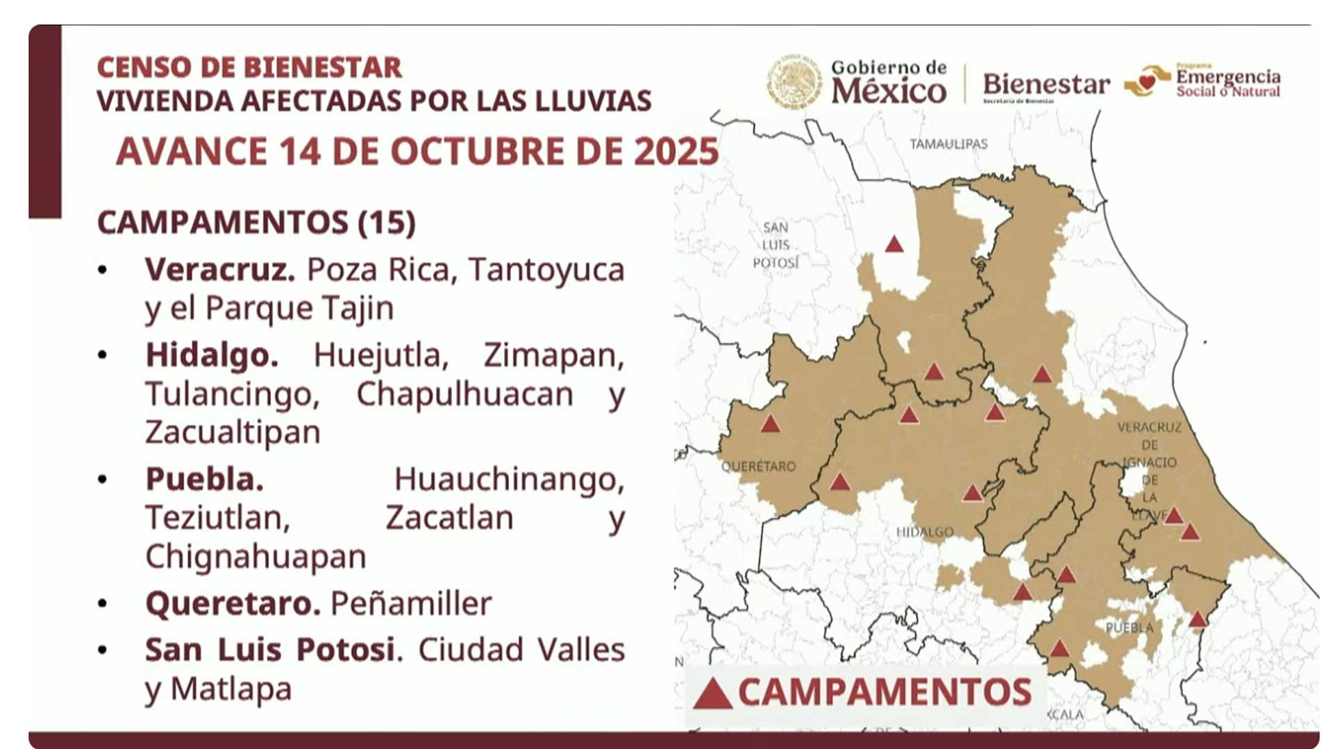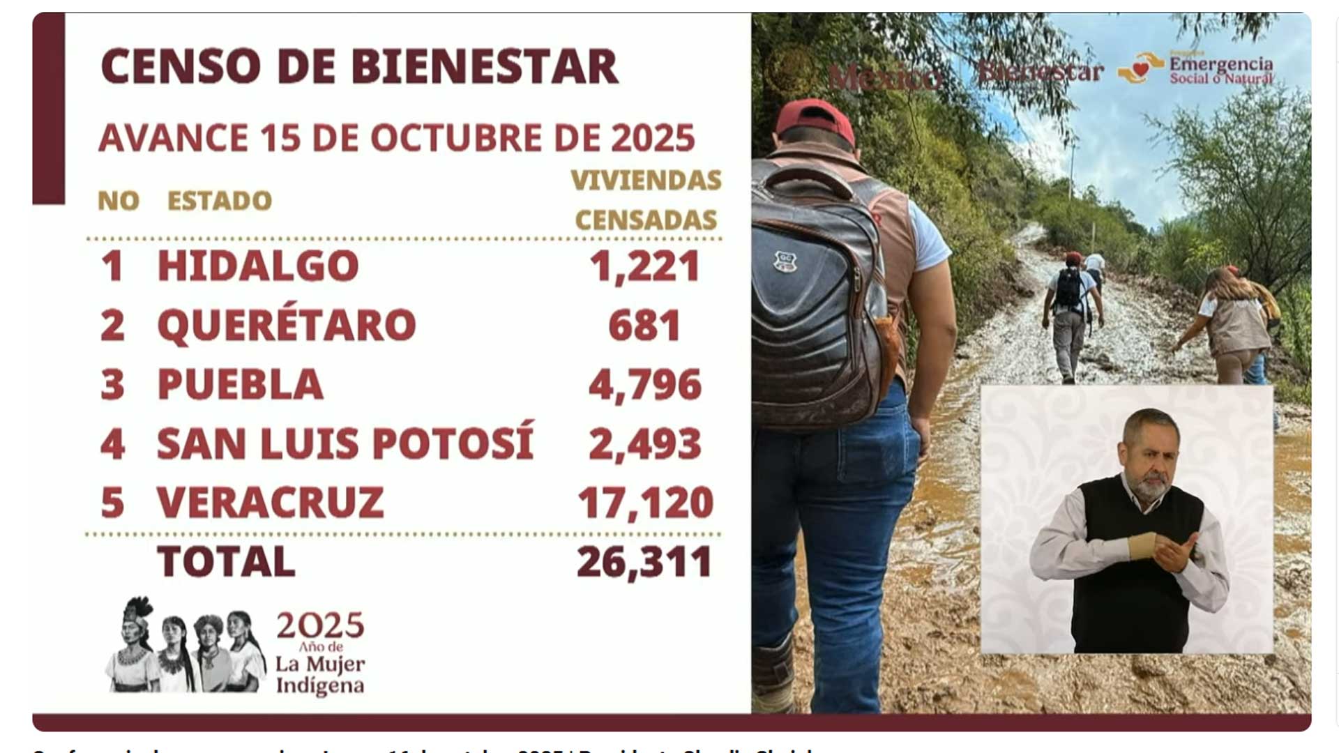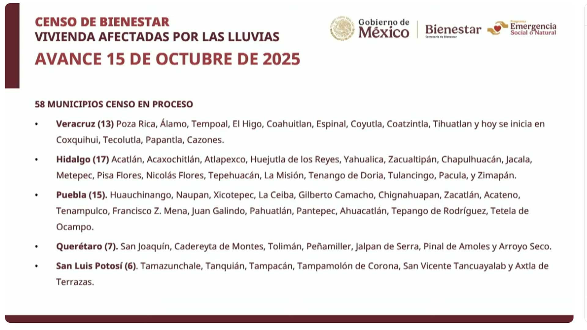 Al corte del 15 de octubre, la Secretaría del Bienestar reportó un total de 26 mil 311 viviendas censadas en 58 municipios de Veracruz, Puebla, San Luis Potosí, Hidalgo y Querétaro, como parte de las acciones emprendidas ante las afectaciones ocasionadas por las intensas lluvias registradas en semanas recientes.
