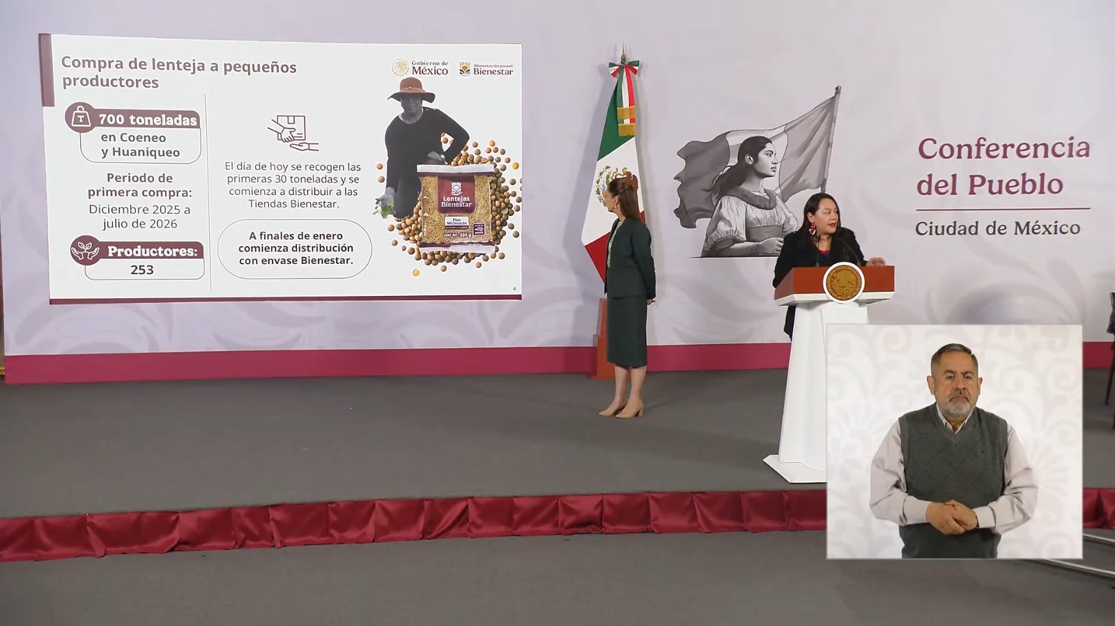 La funcionaria detalló que esta primera fase contempla la salida de la producción ya disponible en manos de los pequeños productores, con el objetivo de evitar pérdidas y garantizar flujo económico durante el proceso de consolidación del programa. También adelantó que la comercialización con la presentación unificada bajo la marca “Lentejas del Bienestar” iniciará a finales de enero de 2026, una vez concluido el embalaje y la imagen oficial.