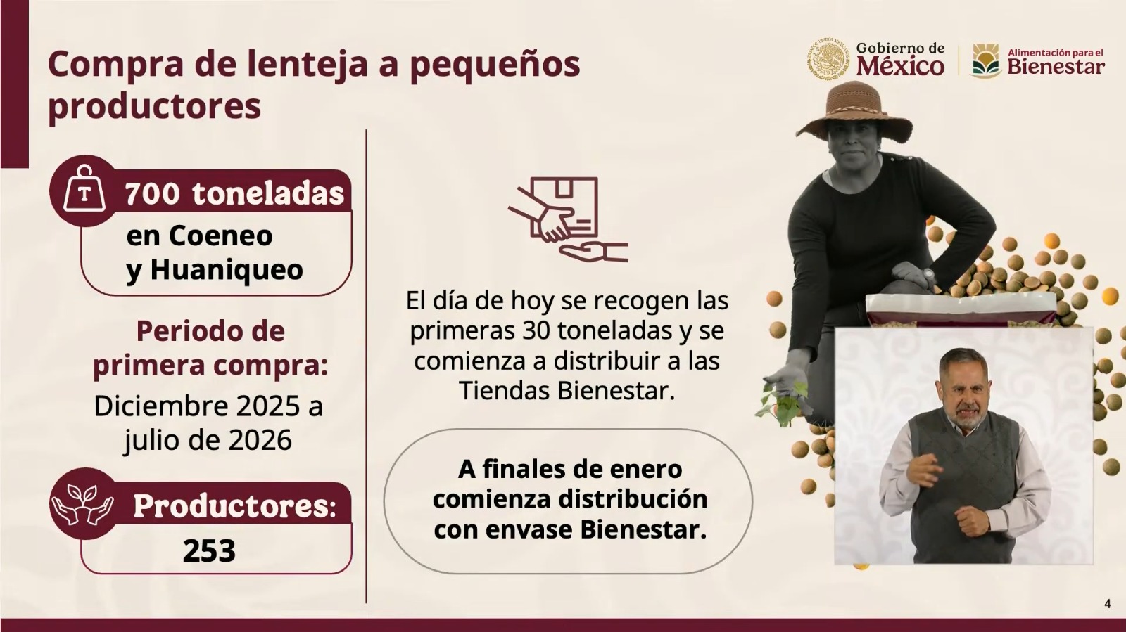 La Secretaría del Bienestar anunció la incorporación de la lenteja como nuevo artículo en las Tiendas del Bienestar, decisión que se concreta tras el arranque del acopio con pequeños productores michoacanos y la integración de inventarios que ya suman 30 toneladas, destinadas a su distribución tanto en Michoacán como en el resto del país. La dependencia explicó que este movimiento forma parte del Plan Michoacán y permitirá que el producto entre en circulación en los próximos días.
